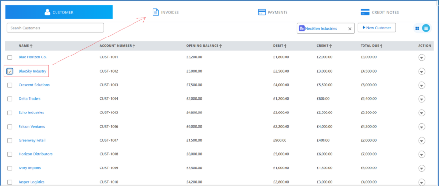 • A new Credit Note and Invoice can be created, and also, the customer’s Account Statement can be viewed by clicking the drop-down list next to the customer.