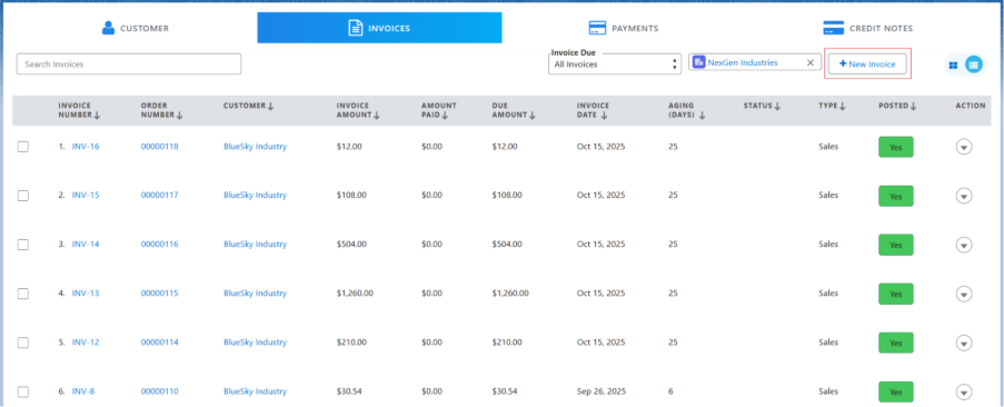 • An invoice can also be created directly from the Invoice tab by clicking the + New Invoice button in the top-right corner of the screen.