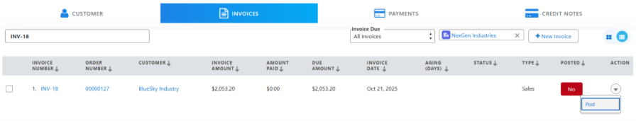 • Select the created invoice. Click the dropdown next to the invoice and select Post/Un-Post.