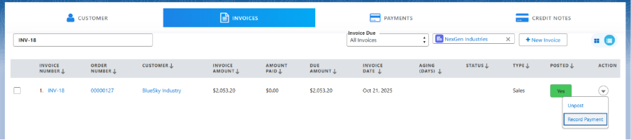 • Once the invoice is posted, click the drop-down and click on the Record Payments option.
