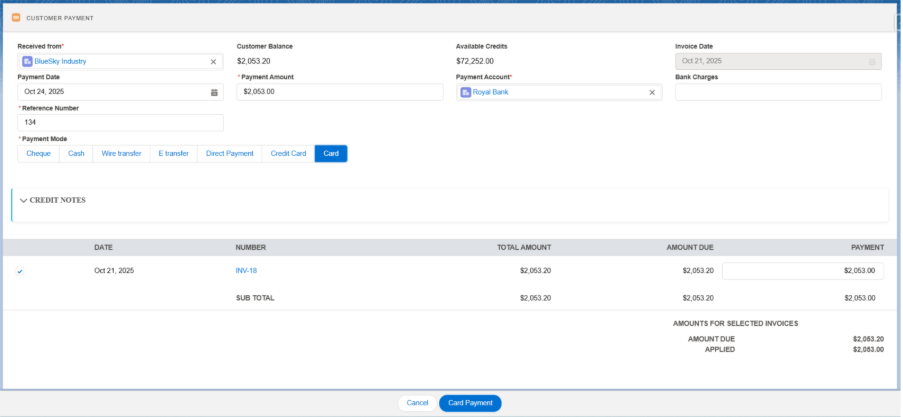 • The Received From (Customer), Customer Balance along with other details will be auto populated after navigating Record Payment screen.