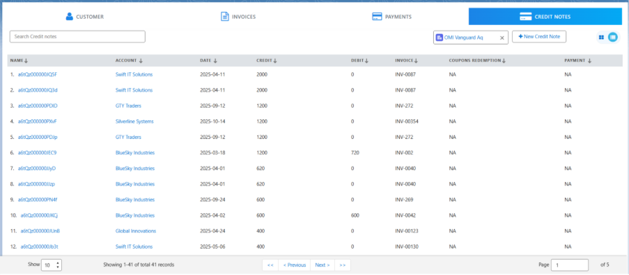 • The Credit Notes tab displays a list of all credit notes.