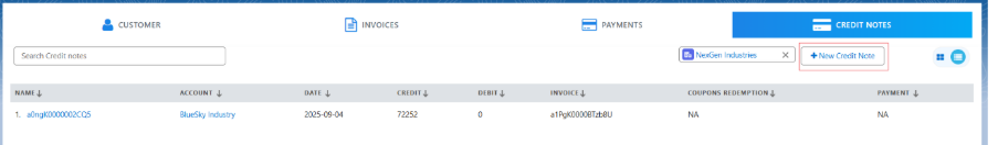 • Under the Credit Notes tab, users can search for a credit note by its name.