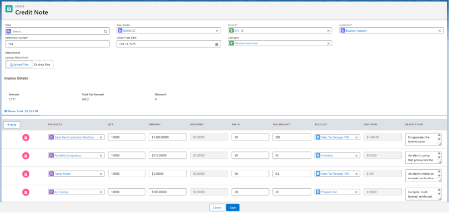 Note 2: A credit note is issued to adjust or refund an Invoice when goods are returned, overcharged, or services are cancelled. It can later be applied toward payments for new invoices.