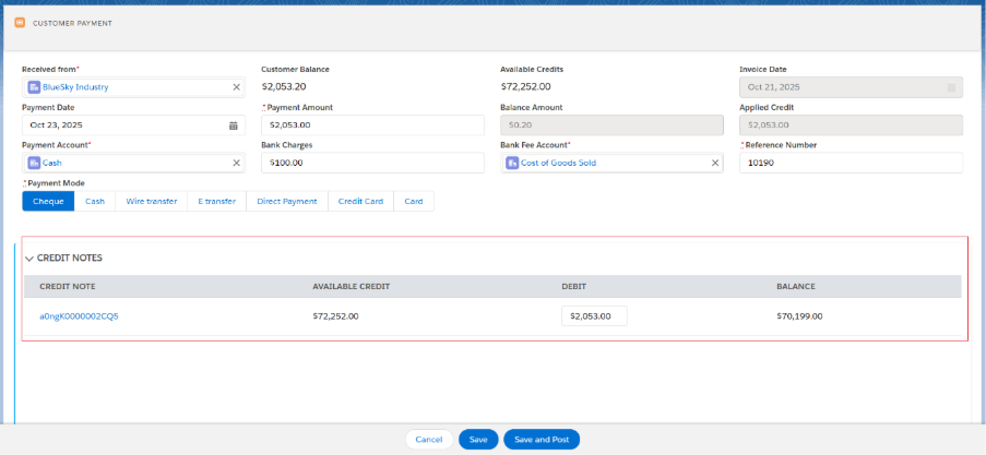 • Select the Payment Mode (Cheque, Cash, Wire Transfer, E-Transfer, Direct Payment, Credit Card, Card(any)), then click Save or Save and Post.