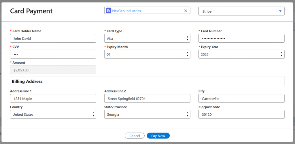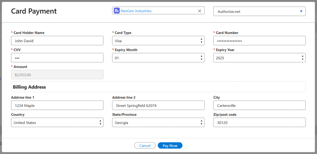• In the Card payment screen, Select the Payment Gateway (Authorize.Net, Stripe). Enter Card Holder Name, select Card Type, Card Number, CVV, Expiry Month, Expiry Year. Billing Address details will be populated.