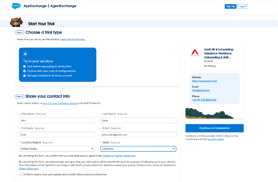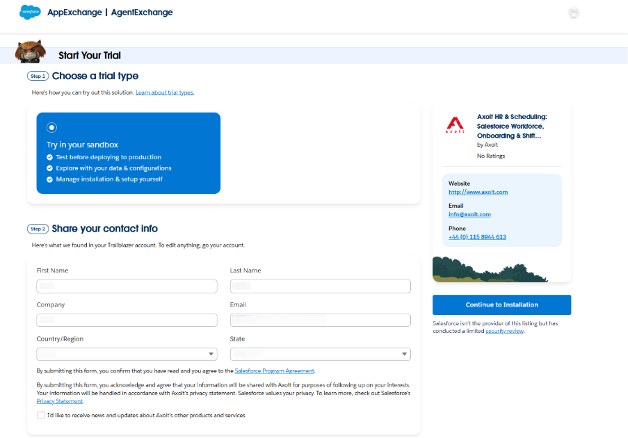 - Navigate to the AppExchange and search for Axolt HR & Scheduling: Salesforce Workforce, Onboarding & Shift Management.