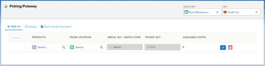 - In the Pick section, select the Source Site and the Cart associated with the source site from where the stock needs to be picked.