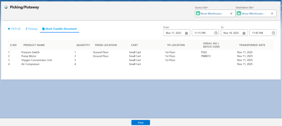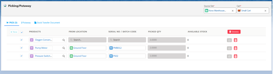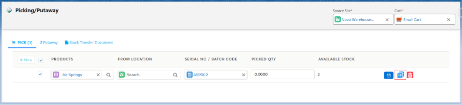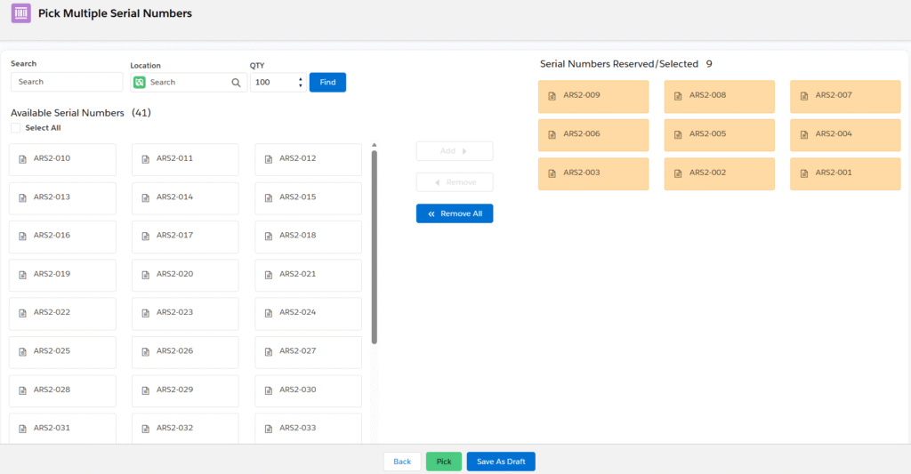 - Clicking the Pick button will pick the selected serial numbers and navigate to the Put Away screen.