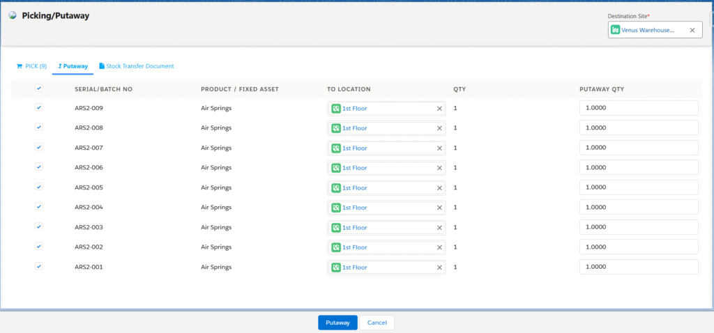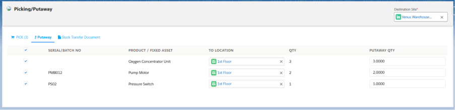 - In the Putaway section, select the Destination Site. Select required Serial Numbers, assign a location if applicable, and click the Putaway button.