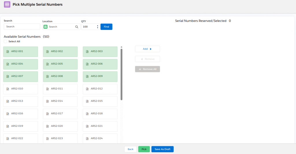 - Clicking the Multi Select button will navigate you to the Pick Multiple Serial Numbers screen.