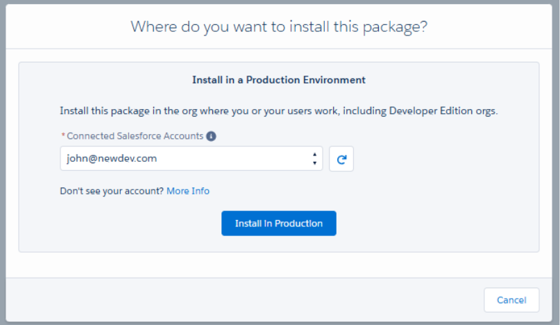 • Once an account is selected, the Install in Production button will be enabled. Click on Install in Production.