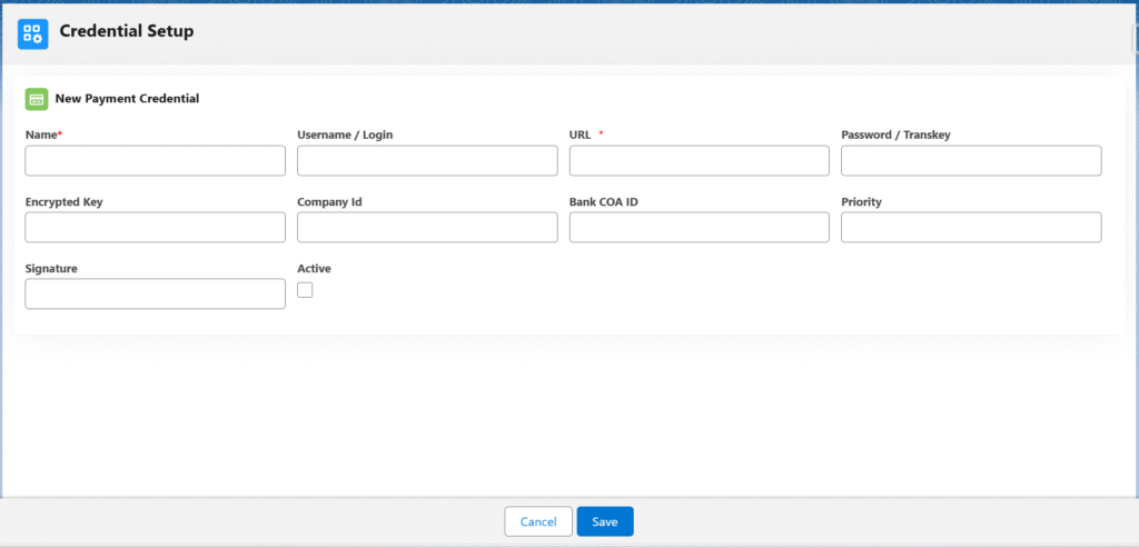 - On the Credentials setup page, enter the Name, Username/Login, URL, Password/Trans key, Encrypted Key, Company ID, Bank COA ID, check the Active checkbox, and click Save.