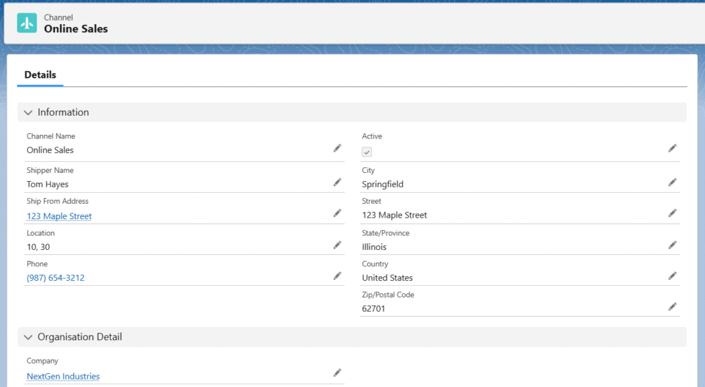- Enter the Channel Name, Shipper Name, select the Ship From Address, enter Phone, select the Company (created Company account), ensure the Active checkbox is checked, enter City, Street, State/Province, Country, and Zip/Postal Code,