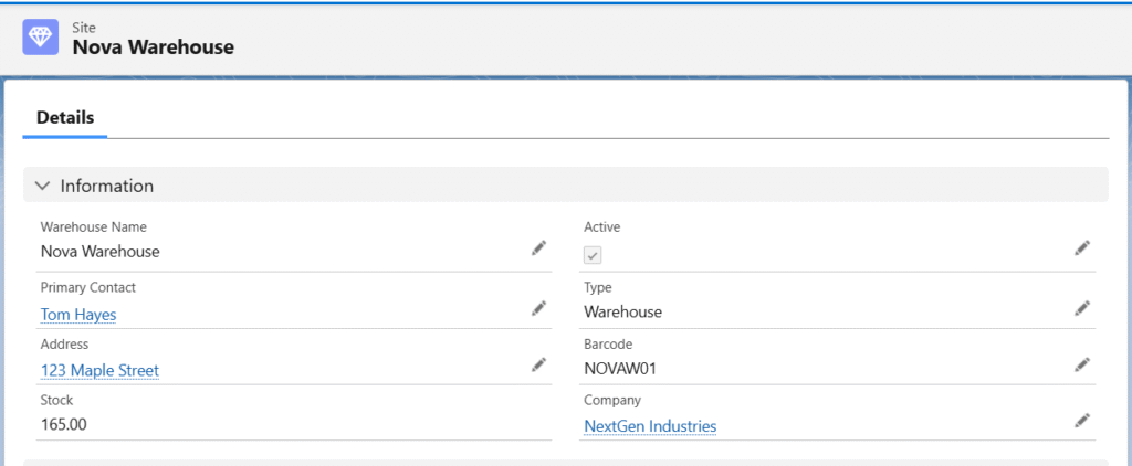 - Enter the Warehouse Name, select the Primary Contact, enter the Capacity of the Site, Address, Company (created Company Account), Active checkbox should be checked, Type should be ‘Warehouse’, enter a Barcode.