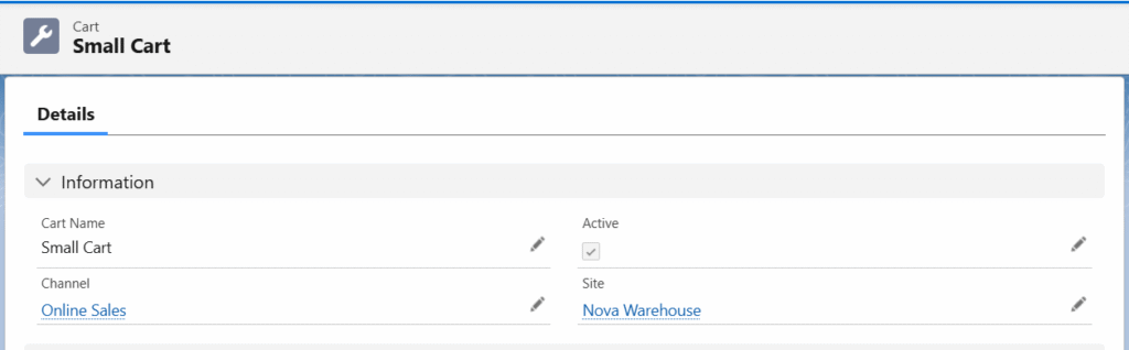 - Enter the Cart Name. The Site will be auto selected. Ensure the Active checkbox is checked, select the Channel (created channel), enter the Account or Employee (if required).