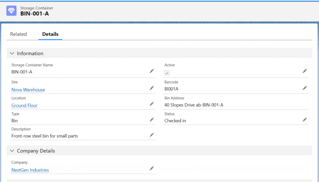 - Go to the related list of the created site and find the Storage Container object (related list).