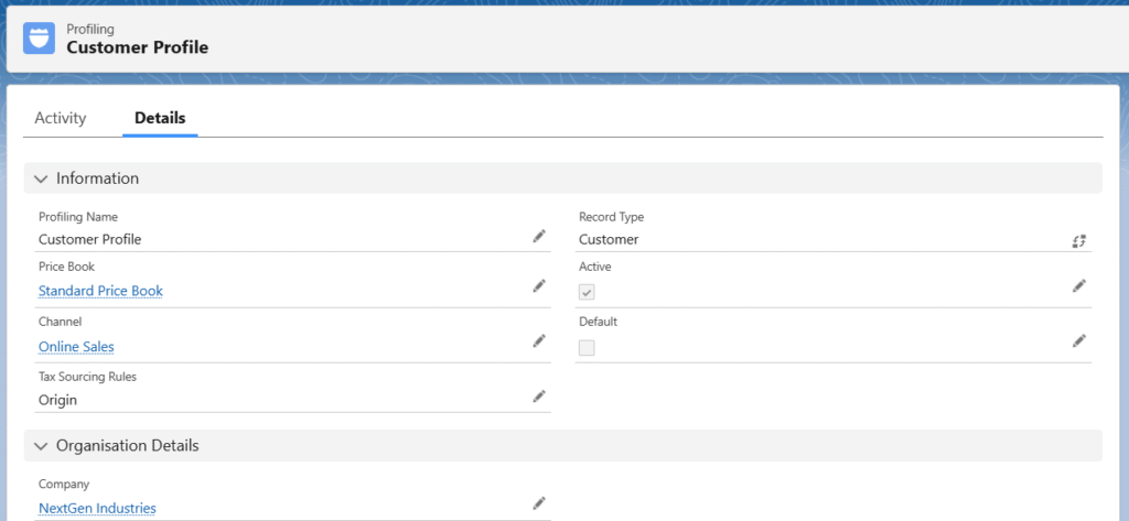 Each Profile is linked to one Price Books that define list prices, currency, and tax settings. Profiles are assigned directly to Customer Accounts.