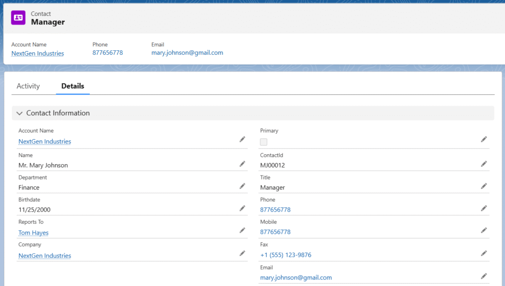 - Enter other optional details if required and click Save to create the new contact record for the company.