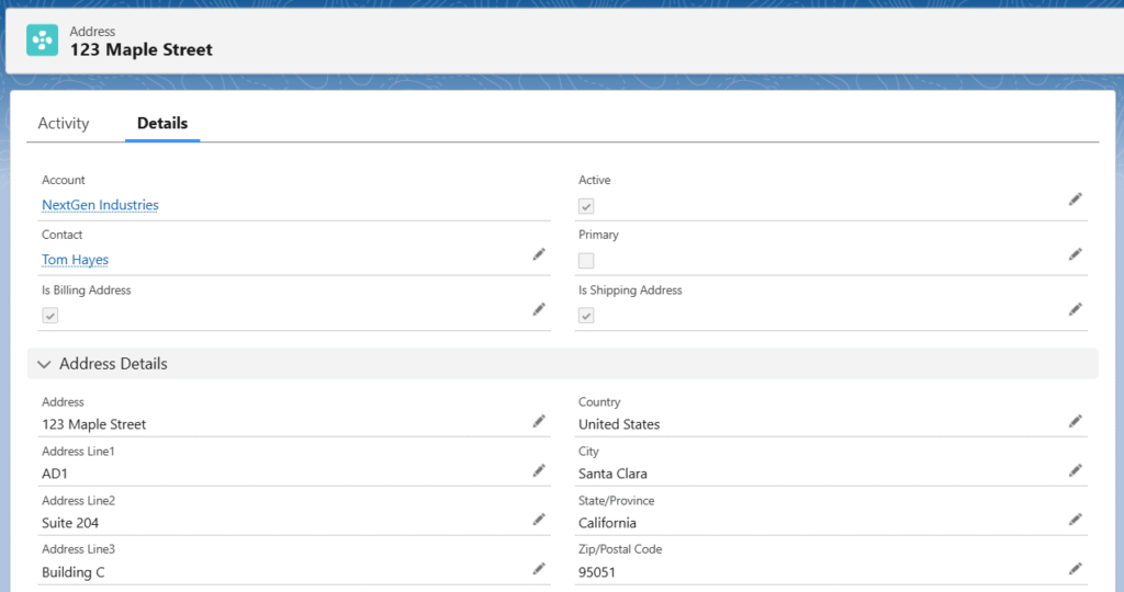 - Navigate to the related tab of the created company account record and locate the Address related list.