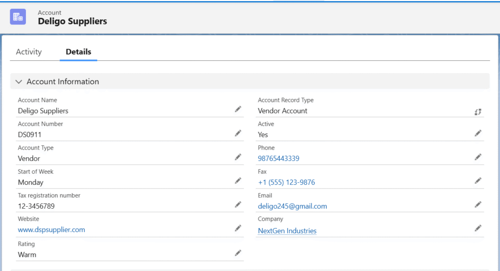 - Enter the Account Name, set the Account Type to Vendor, and choose the Company account (created company account).